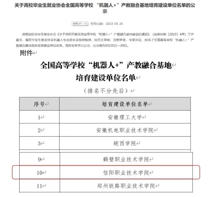 5月25日,教育部高校毕业生就业协会机器人专业委员会公布了全国高等学校“机器人+”产教融合基地首批培育建设单位名单,我校成功入选全国79所建设单位名单,这是我校与江苏汇博机器人技术股份有限公司深入推进产教融合的成果,旨在加快培养机器人产业高素质人才、推动机器人领域教科深度合作、促进高校机器人专业毕业生高质量就业。
