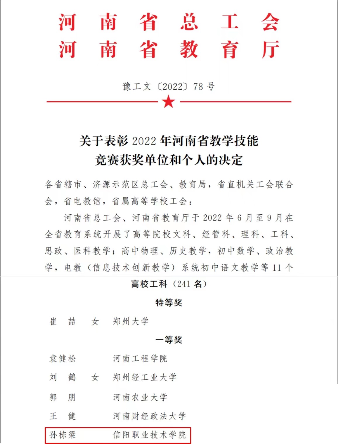 2022年9月16日,由河南省总工会、河南省教育厅主办,河南省教科文卫体工会以及洛阳理工学院承办的河南省教育系统2022年度教学技能竞赛(现场决赛)落下帷幕。信阳职业技术学院乐鱼官方端网站登录入口教师孙栋梁进入决赛,荣获高校工科组一等奖,被授予“河南省优秀教学标兵”荣誉称号。