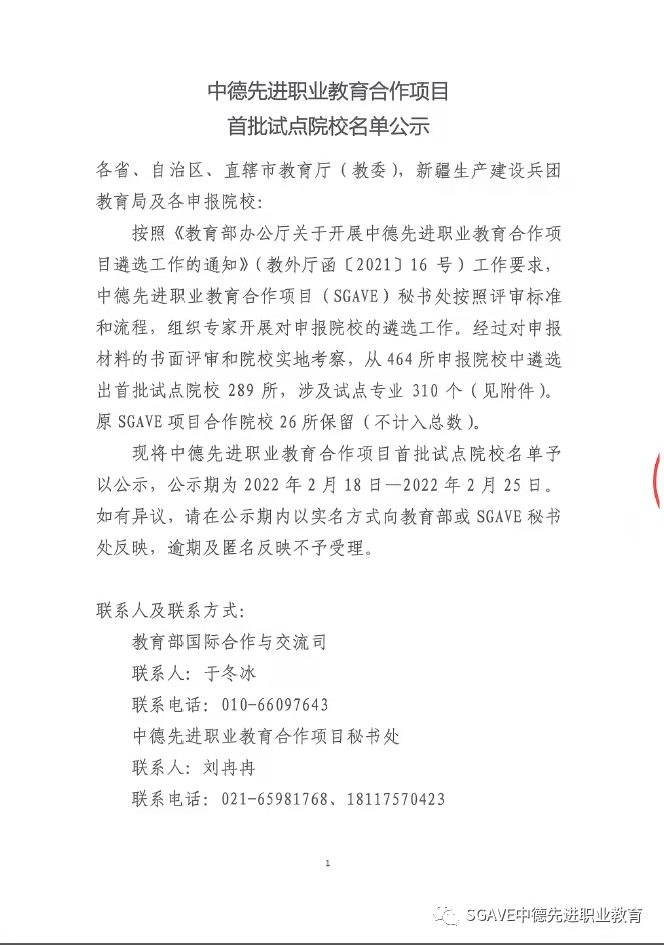 中德先进职业教育合作项目(简称SGAVE项目)是教育部与德国等欧洲职业教育模式先进国家行业龙头企业联合实施的职业教育合作项目。